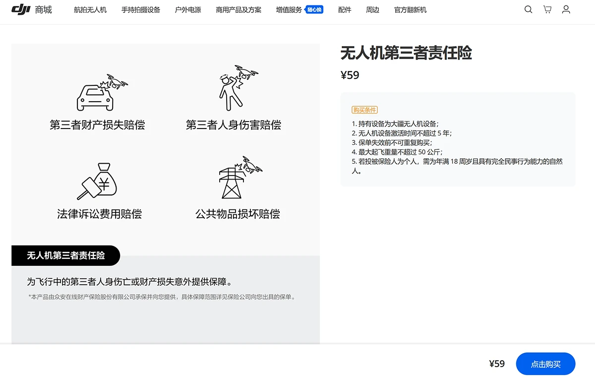 最近无人机管制越来越严格,无人机从事商业活动时,按规定需要购买第三方责任险,用于以防无人机失控从而带来第三方的损失,那我们怎么买呢?我们可以登录在大疆商城里直接点向购买。大疆在线地址:https://store.dji.com/cn/product/liability-insurance?vid=161481